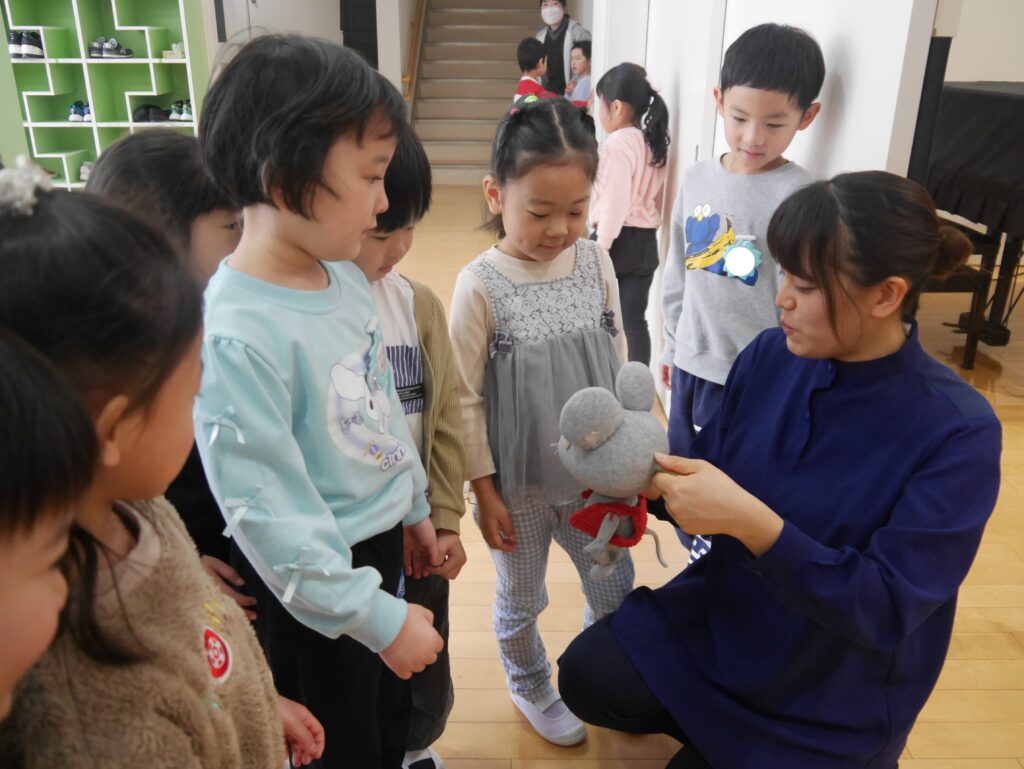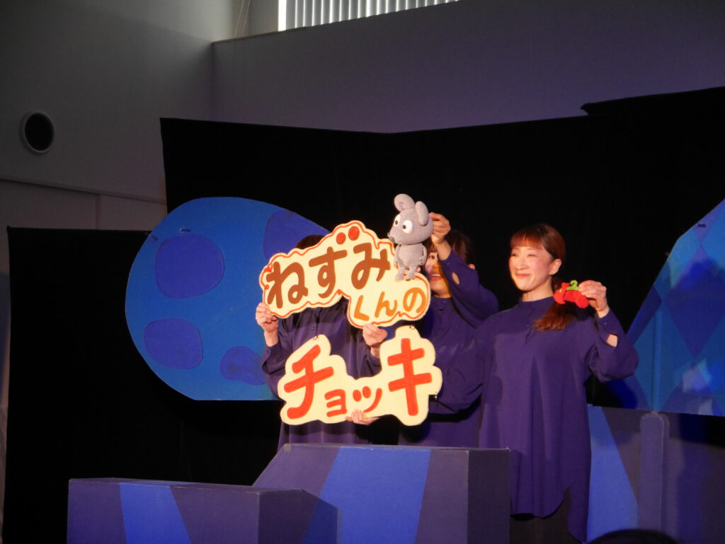 みんながホールに集まり、セットを見ると「あれ何かな?」「どこから出てくるの?」と興味津々。今回観劇したお話は『森の四季』と『ねずみくんのチョッキ』の2つ。始まるとすぐに人形たちの動きや声に引き込まれ、子どもたち、大人もお話を楽しんで観ることができました!最後は人形たちにお見送りをしてもらって嬉しそうな子どもたち。早速2階の絵本コーナーでねずみくんシリーズを読んでいました🐭