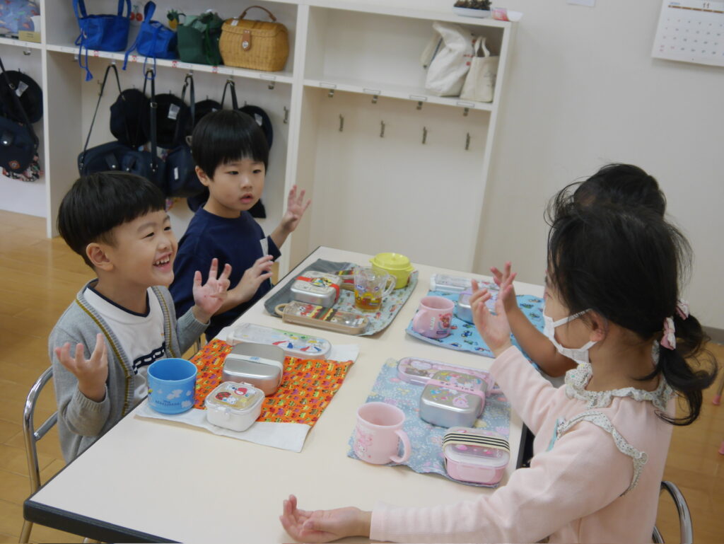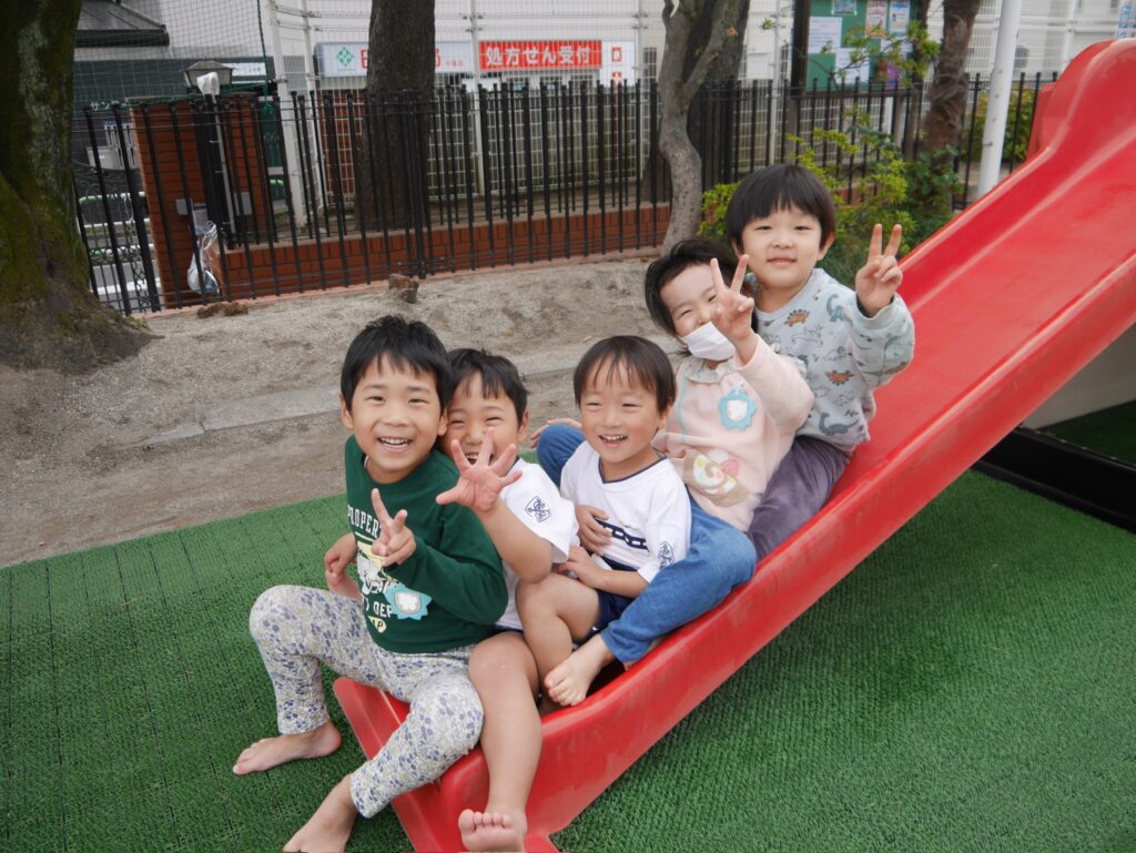 ホールで花いちもんめをしたり、お外でみんなで滑り台を滑ったり。お弁当も一緒に食べることができました🍙