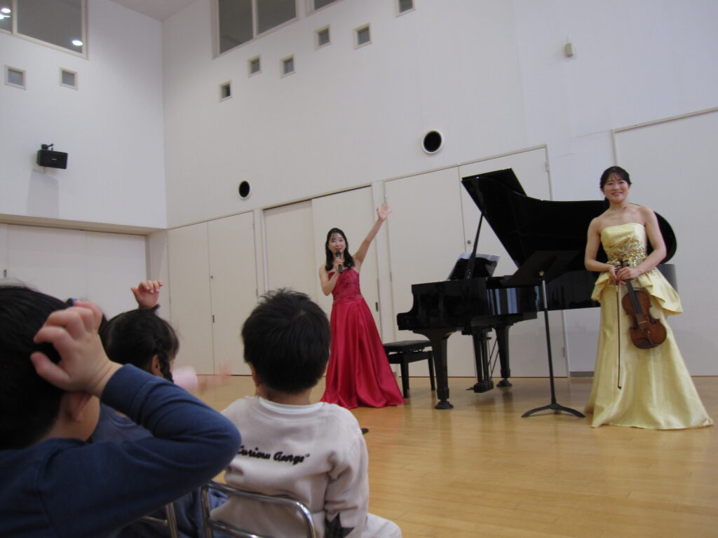 1月15日(木)に音楽会が行われ、ヴァイオリニストの伊藤 万桜さんとピアニストの木邨 清華さんが演奏をしてくださいました。この日、幼稚園のみんなはお客さま🎀