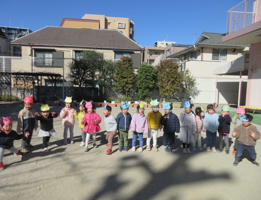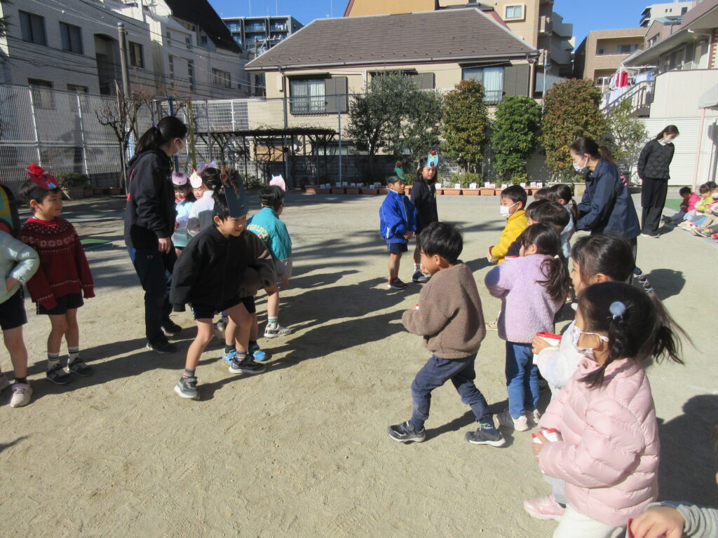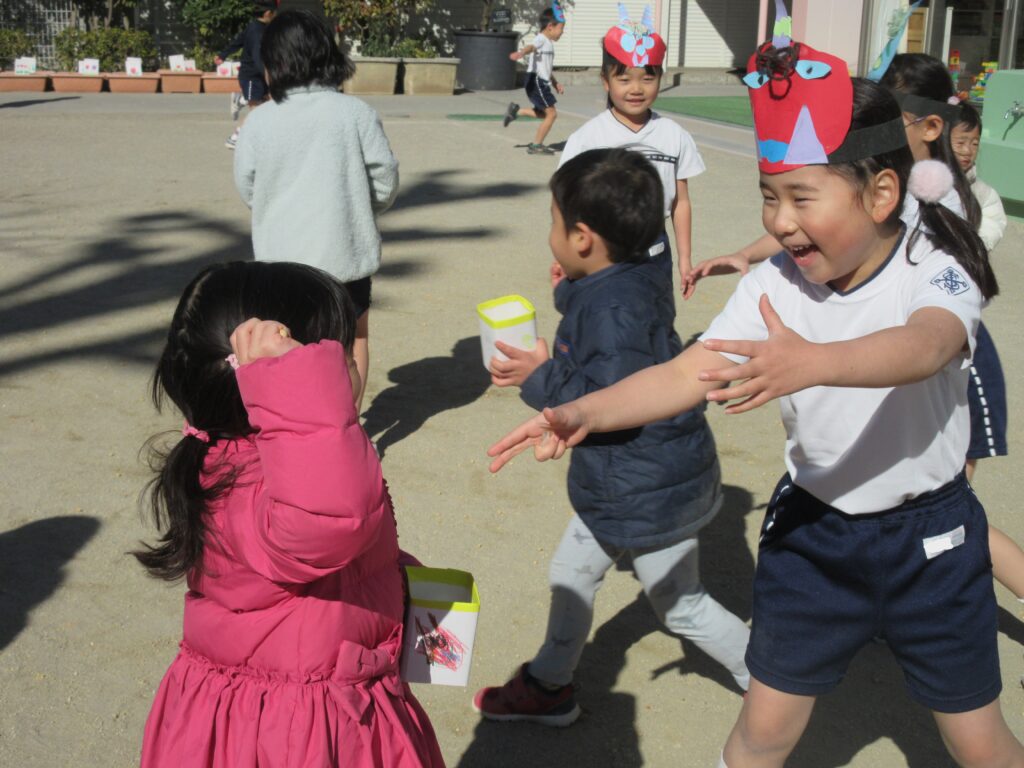 当日は年長組さんと年少組。年中組同士で豆まきを。豆を投げる子どもたちは大きい声で「おには そと~!ふくは うち~!」