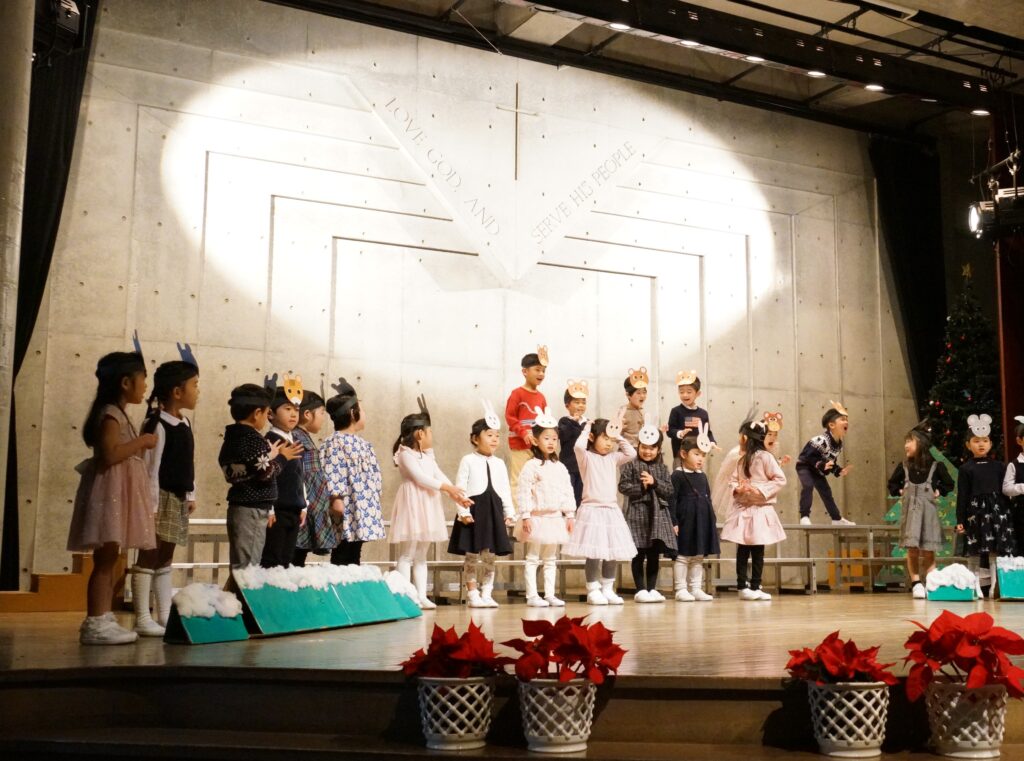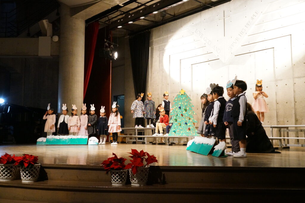このチャペルで劇をするのは初めて。どうぶつさん、てんしさんが出てくる劇で、リハーサルの時から大きい声で楽しく!を意識して練習していました♪