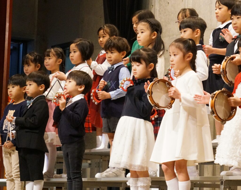 カスタネット、タンバリン、すず、トライアングル、シンバル、大太鼓にそれぞれ分かれ『ジングルベル』を合奏しました。