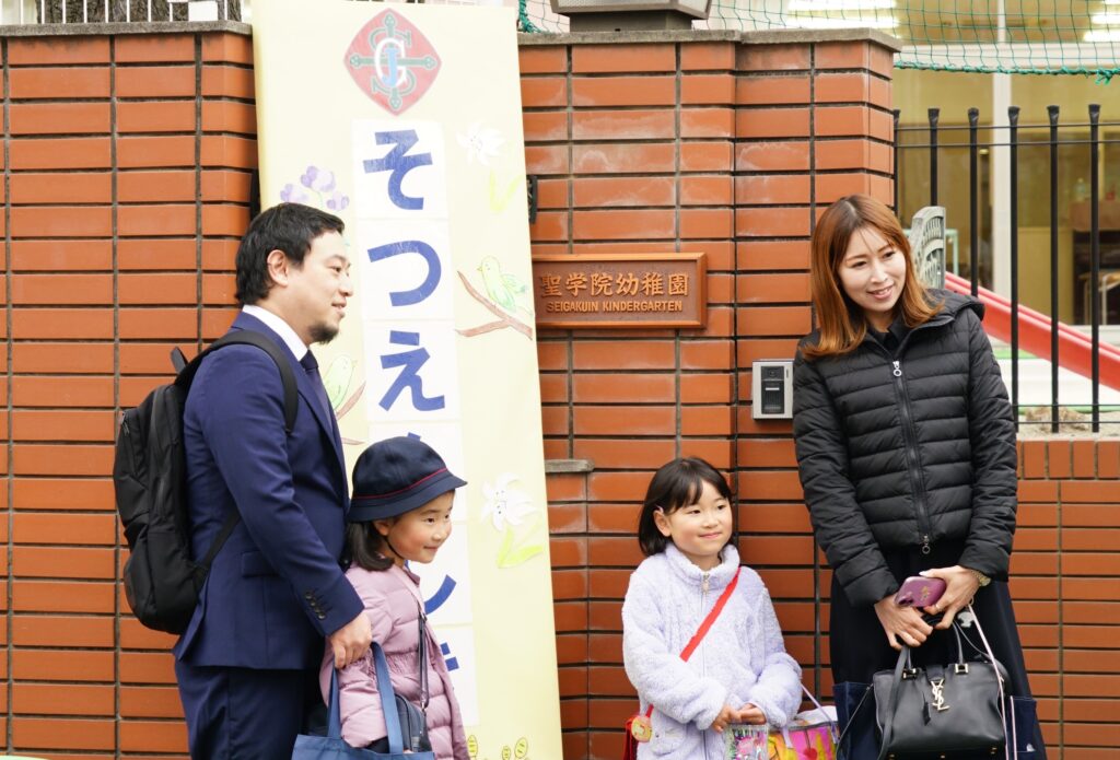 みんなが幼稚園に揃うのはこの日が最後。大好きなお家の方と一緒に手を繋いで登園していました。