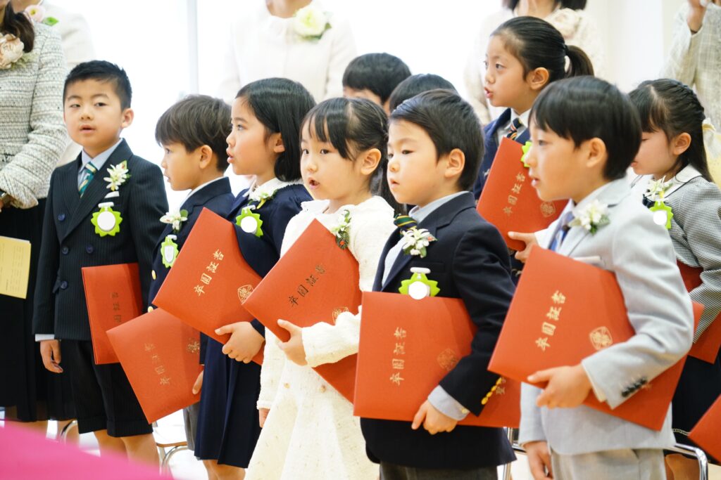 担任の先生から名前を呼ばれると元気よく返事をし、園長先生から卒園証書を受け取りました。讃美歌では優しい声で心を一つにして歌う姿があり、顔立ちも立派なお兄さん、お姉さんになっていました。卒園式が終わり、一度お部屋に戻るとみんなホッとした表情に。手元にある卒園証書を見て、とても嬉しそうでした😊